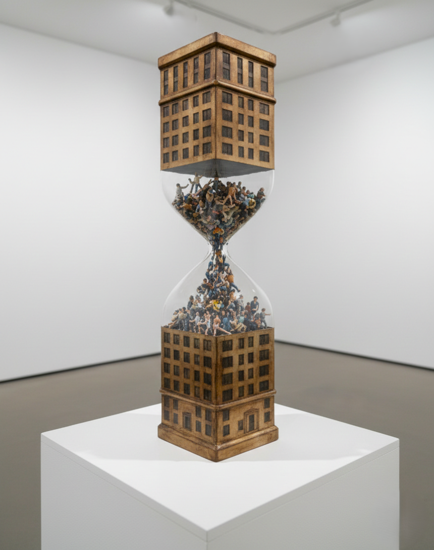 “Synchronized Loneliness” renders visible the impact of contemporary architecture on individuals through the hourglass form created by two...